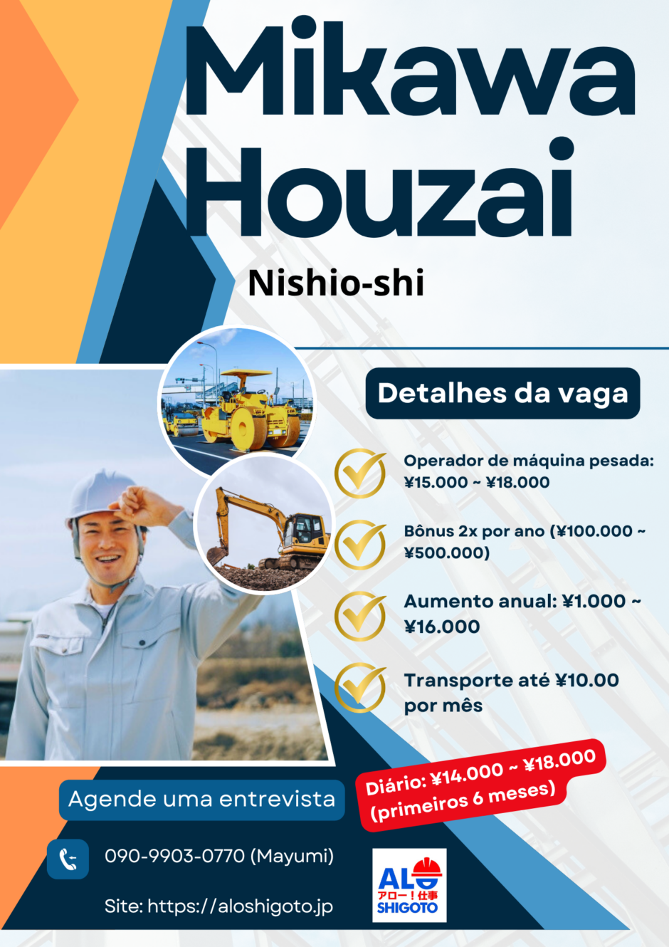 | Trabalho na área de engenharia civil, em obras de pavimentação. O local da obra nas redondezas de Nishio.Encontra-se na empresa para ir até o local. Necessário carteira de motorista de veículos e máquinas de construção. |